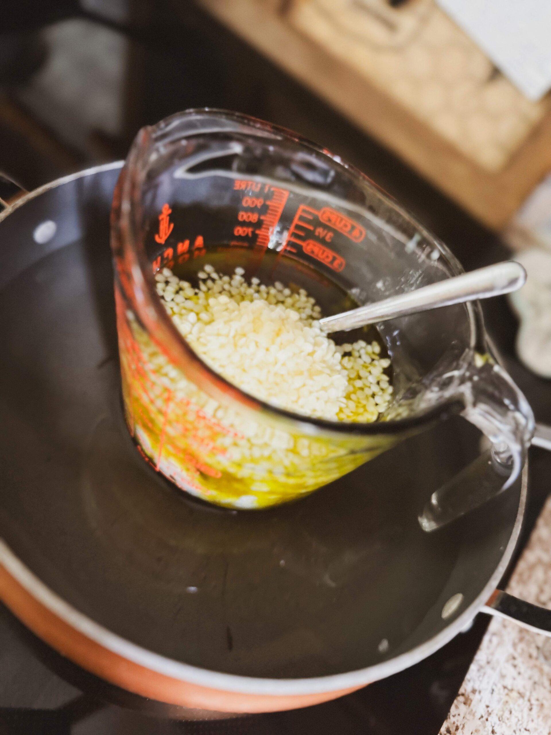 In a heat safe glass place coconut oil, herbal infused oil, and beeswax. Then heat on stove top using a double boil method, such as placing water in saucer pan and then placing your heat proof glass container in pan.